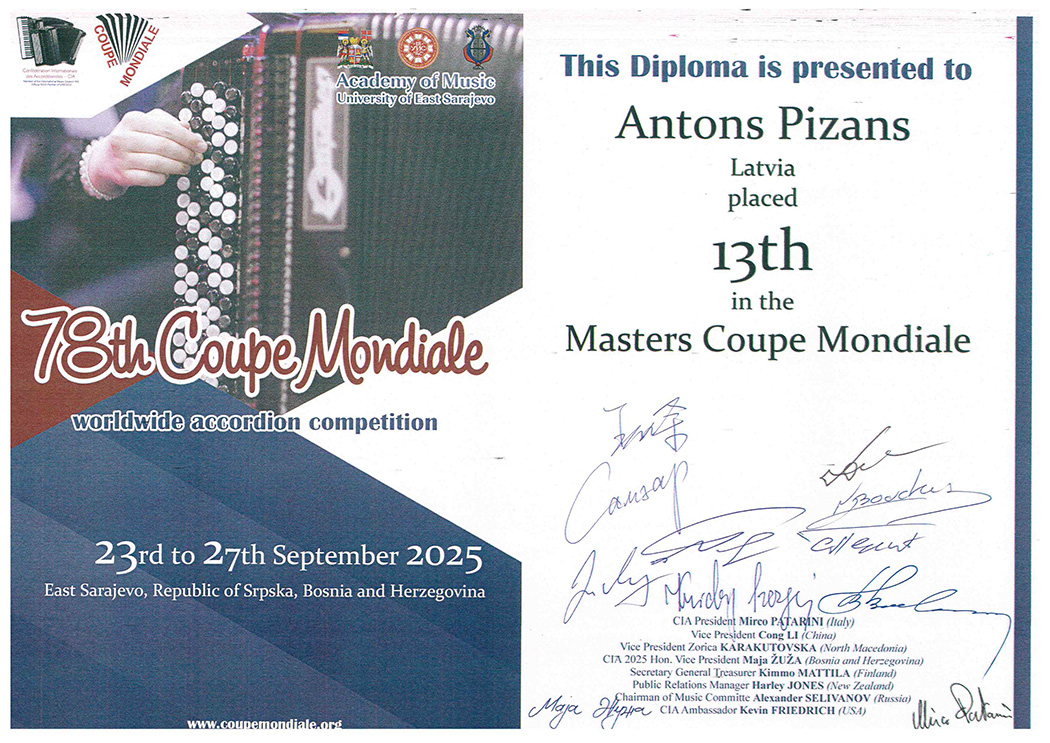 No 23. līdz 28. septembrim Austrumu Sarajevā (Bosnijā un Hercegovinā) norisinājās 78. Starptautiskais akordeona konkurss “Coupe Mondiale”, ko organizē Confédération Internationale des Accordéonistes (CIA). Šis prestižais pasākums pulcēja izcilākos akordeonistus no visas pasaules, piedāvājot plašu kategoriju klāstu – no solo un kamermūzikas līdz ansambļiem un “entertainment music”.